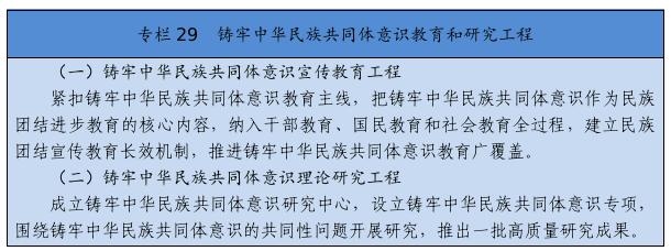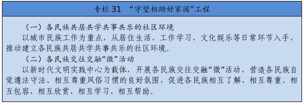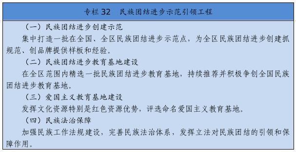 在全社會樹立和突出各民族共享的具有鮮明中華文化特征的文化符號和中華民族視覺形象,打造中國標志。堅定不移推廣普及國家通用語言文字,全面加強國家通用語言文字教育教學(xué),積極穩(wěn)妥推行國家統(tǒng)編教材使用,深化雙語教學(xué)模式改革,確保少數(shù)民族學(xué)生掌握和使用國家通用語言文字。尊重、支持各少數(shù)民族語言文字的學(xué)習(xí)和使用。堅持以社會主義先進文化為引領(lǐng),促進各民族文化交融、創(chuàng)新。提倡文明現(xiàn)代的生活方式,引導(dǎo)和幫助各族群眾追求現(xiàn)代文明生活,推進民族進步。強化全體公民日常行為規(guī)范,完善市民公約、鄉(xiāng)規(guī)民約、學(xué)生守則、行業(yè)規(guī)章、職業(yè)規(guī)則、團體章程,營造自覺遵法守法、尊重少數(shù)民族風俗習(xí)慣和宗教信仰、維護民族團結(jié)的社會氛圍。著力開展興邊富民行動,打牢守邊固邊的民族團結(jié)基礎(chǔ)。