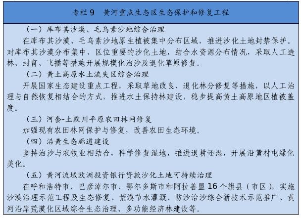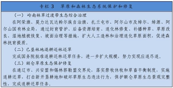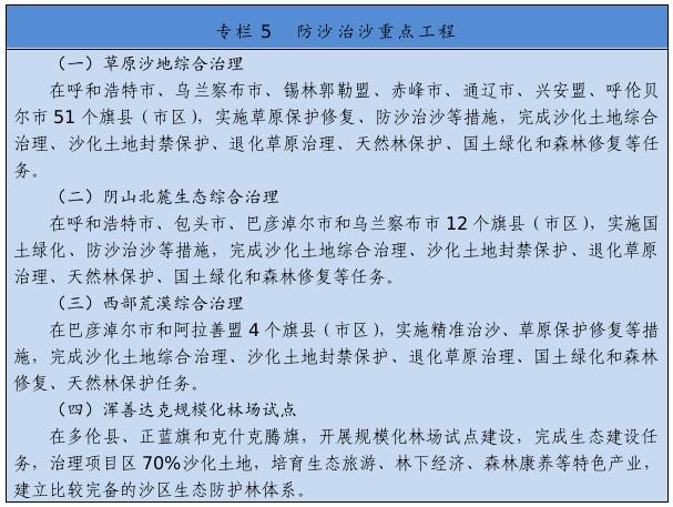 繼續(xù)實施京津風沙源治理等重點工程,推廣庫布其沙漠治理方式和沙產(chǎn)業(yè)模式,推動渾善達克、烏珠穆沁、呼倫貝爾沙地治理。推進規(guī)?;謭鼋ㄔO(shè),采取人工造林、封沙育林、飛播造林等方式恢復(fù)植被。建設(shè)荒漠綠洲防護林、防風固沙林、沙漠鎖邊林、農(nóng)田草牧場防護林以及水土保持林。以干旱半干旱草原為重點,加強草場改良和人工種草,實行圍封禁牧、劃區(qū)輪牧、季節(jié)性休牧、舍飼圈養(yǎng)等措施,保護和恢復(fù)草原植被。以內(nèi)蒙古高原等為重點,推進防護林體系建設(shè)及退化林修復(fù)、退化草原修復(fù)、京津風沙源治理。新增水土流失綜合治理3.33萬平方公里。