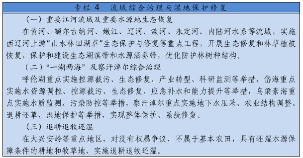 大力推進黃河生態(tài)帶建設(shè),統(tǒng)籌水環(huán)境、水生態(tài)、水資源、水安全、水文化,推進干支流一體化治理,突出抓好十大孔兌、多沙粗砂區(qū)集中來源區(qū)等水土保持治理,實施河道和灘區(qū)綜合提升治理工程,完善水沙調(diào)控機制。深化“一湖兩海”及察汗淖爾生態(tài)環(huán)境綜合治理,創(chuàng)新區(qū)域系統(tǒng)治理和流域整體治理舉措,逐步改善生態(tài)環(huán)境。全面加強嫩江、遼河、內(nèi)陸河水系等流域和達里諾爾、烏拉蓋等濕地生態(tài)保護修復(fù),深入開展地下水超采綜合治理。