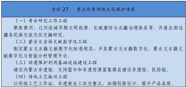 實施文化遺產(chǎn)系統(tǒng)性保護工程,強化重要文化和自然遺產(chǎn)、非物質(zhì)文化遺產(chǎn)系統(tǒng)性保護,建立整體保護、活態(tài)傳承、創(chuàng)新發(fā)展體系。實施重大文物保護工程,推進長城、黃河國家文化公園和大窯、遼上京、和林格爾土城子等國家考古遺址公園建設(shè)。推動萬里茶道(內(nèi)蒙古段)、遼上京和祖陵遺址、紅山遺址群和陰山巖刻申遺。加強阿爾寨石窟寺等石窟文物保護。開展“中華文明探源”工程、“考古中國”河套地區(qū)早期聚落遺址考古發(fā)掘研究。建設(shè)內(nèi)蒙古非遺博覽園、內(nèi)蒙古黃河文化博物館、內(nèi)蒙古工業(yè)博物館。加強紀念館、展覽館、博物館建設(shè)管理。推進民族優(yōu)秀傳統(tǒng)手工藝保護傳承和振興,完善非遺名錄體系。實施中華傳統(tǒng)節(jié)日振興工程,開展傳統(tǒng)節(jié)日禮儀禮節(jié)教育活動。