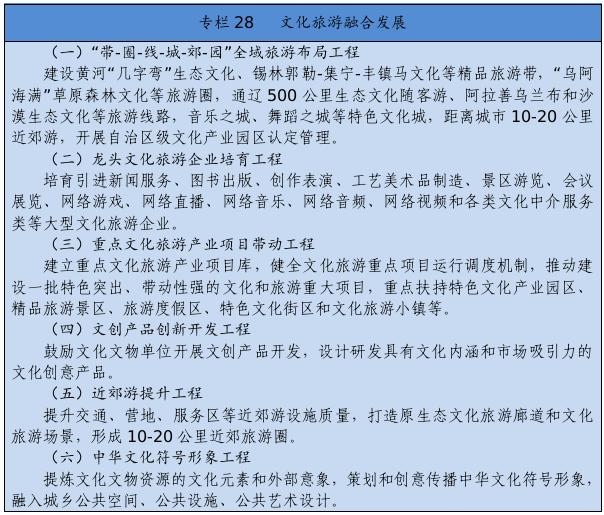 跨盟市打造大景區(qū),跨區(qū)域布設(shè)“黃金線”,建設(shè)以生態(tài)為底色、以文化為特色、以旅游為產(chǎn)業(yè)支撐的“帶-圈-線-城-郊-園”文旅融合發(fā)展格局。創(chuàng)建全域旅游示范區(qū),推動?xùn)|中西部旅游業(yè)差異化協(xié)調(diào)發(fā)展,東部地區(qū)重點推進生態(tài)旅游、邊境旅游、冰雪旅游提檔升級,打造呼倫貝爾國內(nèi)一流草原森林生態(tài)和邊境旅游目的地;中部地區(qū)重點發(fā)展文化遺產(chǎn)、草原風情、健康體育和休閑度假,打造呼和浩特現(xiàn)代休閑與會展旅游中心、鄂爾多斯文化體驗和休閑旅游目的地;西部地區(qū)推動發(fā)展特色生態(tài)旅游、沙漠休閑和自駕越野,打造阿拉善國內(nèi)知名西部風情旅游區(qū)。豐富創(chuàng)新高品質(zhì)文化旅游產(chǎn)品供給,積極發(fā)展中高端旅游,提供個性化定制服務(wù),大力發(fā)展紅色旅游、馬文化旅游、康養(yǎng)旅游、研學(xué)旅游、體育旅游、邊境旅游和刺繡產(chǎn)業(yè)。推動旅游景區(qū)提檔升級,開展文化演藝、非遺和文創(chuàng)產(chǎn)品進景區(qū)活動,加快建設(shè)智慧旅游景區(qū)、跨境旅游試驗區(qū)。創(chuàng)建鄉(xiāng)村旅游重點村,培育鄉(xiāng)村旅游融合發(fā)展示范區(qū)。完善旅游公共服務(wù)設(shè)施,提升旅游咨詢中心、公共停車場、旅游廁所等服務(wù)功能。統(tǒng)籌“風景道+景區(qū)+鄉(xiāng)村+自駕車營地”,建立健全自駕游服務(wù)體系。整合利用公路、高鐵和航空網(wǎng)絡(luò),構(gòu)建安全便捷的全域旅游交通體系。實施文化和旅游品牌戰(zhàn)略,統(tǒng)籌做好旅游營銷。實施文化旅游資源開發(fā)利用工程,組織開展全區(qū)文化和旅游資源普查,建立文化和旅游資源數(shù)據(jù)庫。