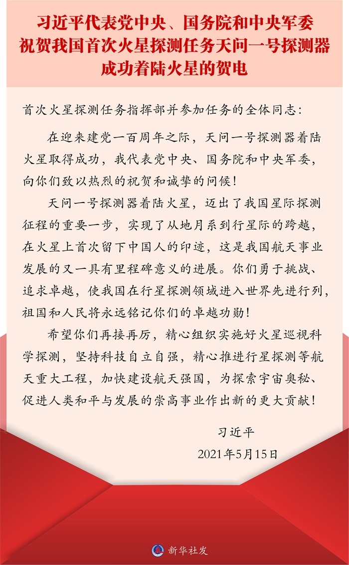 【學(xué)習(xí)進(jìn)行時(shí)】5月15日,我國(guó)首次火星探測(cè)任務(wù)著陸火星取得成功。習(xí)近平總書(shū)記致賀電,向首次火星探測(cè)任務(wù)指揮部并參加任務(wù)的全體同志致以熱烈的祝賀和誠(chéng)摯的問(wèn)候。新華社《學(xué)習(xí)進(jìn)行時(shí)》原創(chuàng)品牌欄目“講習(xí)所”今天推出文章,為您解讀。