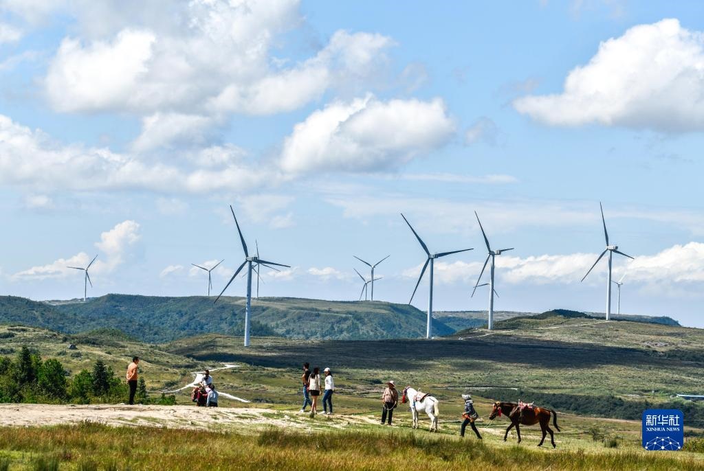 游客在貴州省龍里縣龍里大草原的風(fēng)電場觀光(9月21日攝)。新華社記者 楊文斌 攝