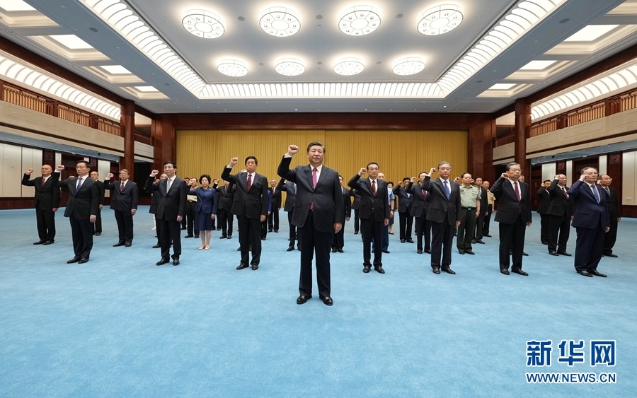 2021年6月18日,黨和國家領導人習近平、李克強、栗戰(zhàn)書、汪洋、王滬寧、趙樂際、韓正、王岐山等在中國共產黨歷史展覽館參觀“‘不忘初心、牢記使命’中國共產黨歷史展覽”。這是參觀結束后,習近平帶領黨員領導同志一起重溫入黨誓詞。新華社記者 李學仁 攝