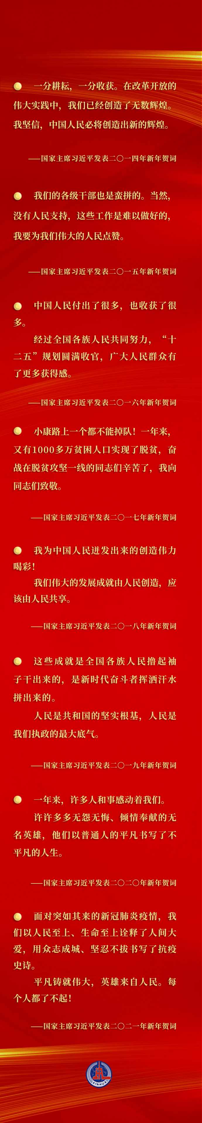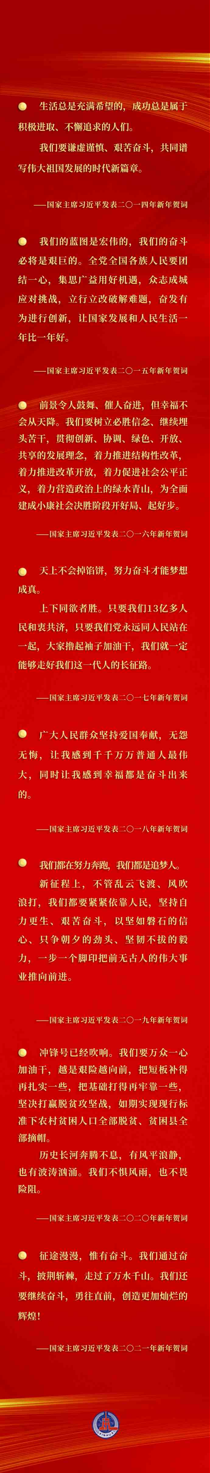 每年的新年賀詞,都在激勵我們乘勢而上、接續(xù)奮斗,匯聚激勵各族人民團(tuán)結(jié)一心、并肩奮斗的強(qiáng)大合力。