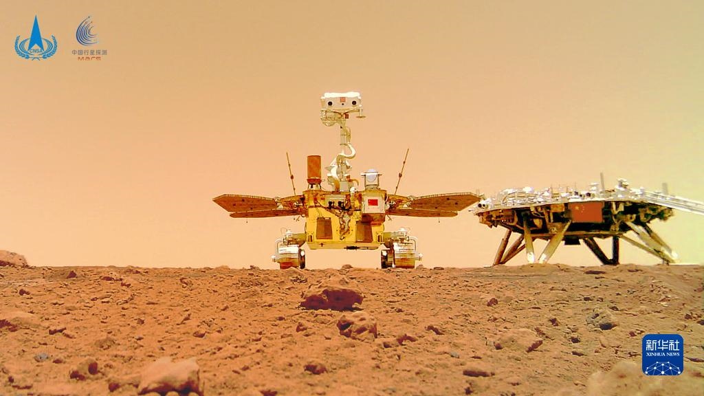 這是“著巡合影”圖。2021年6月11日,國家航天局在北京舉行天問一號探測器著陸火星首批科學影像圖揭幕儀式,公布了由祝融號火星車拍攝的著陸點全景、火星地形地貌、“中國印跡”和“著巡合影”等影像圖。首批科學影像圖的發(fā)布,標志著我國首次火星探測任務取得圓滿成功。新華社發(fā)(國家航天局供圖)