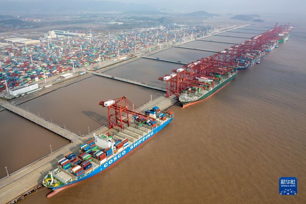 浙江寧波舟山港梅山港區(qū)集裝箱碼頭一派繁忙景象(2021年12月17日攝,無人機照片)。新華社發(fā)(蔣曉東攝)