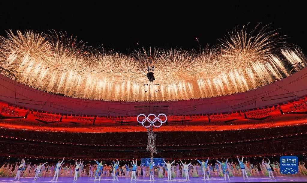 2022年2月20日晚,北京第二十四屆冬季奧林匹克運動會閉幕式在國家體育場舉行。這是焰火表演。新華社記者曹燦攝