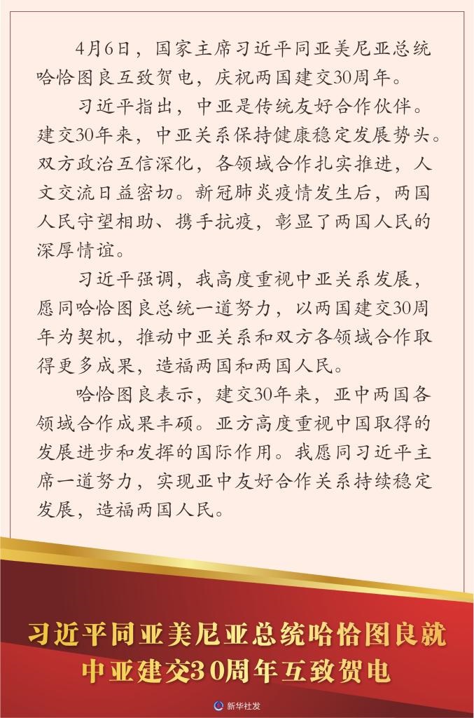 習近平強調(diào),我高度重視中亞關系發(fā)展,愿同哈恰圖良總統(tǒng)一道努力,以兩國建交30周年為契機,推動中亞關系和雙方各領域合作取得更多成果,造福兩國和兩國人民。