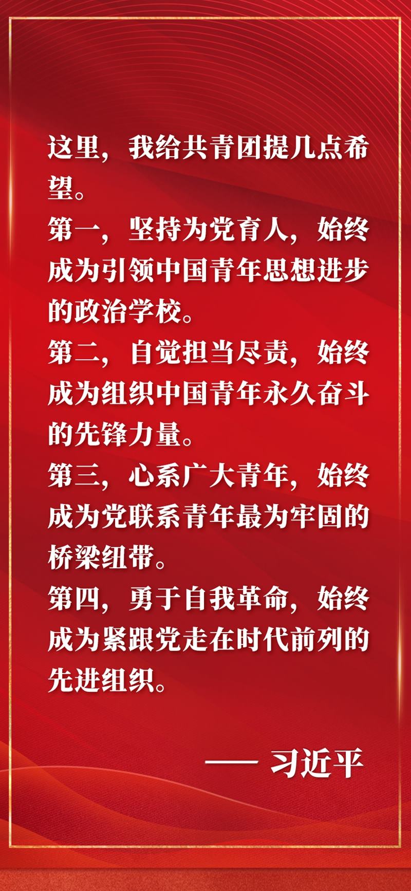 慶祝中國共產主義青年團成立100周年大會10日上午在北京人民大會堂隆重舉行。中共中央總書記、國家主席、中央軍委主席習近平在會上發(fā)表重要講話,全面回顧百年來共青團堅定不移聽黨話、跟黨走的奮斗歷程,深刻闡明共青團和青年工作的寶貴經驗,對當代青年寄予殷切期望,對做好新時代共青團工作提出明確要求。