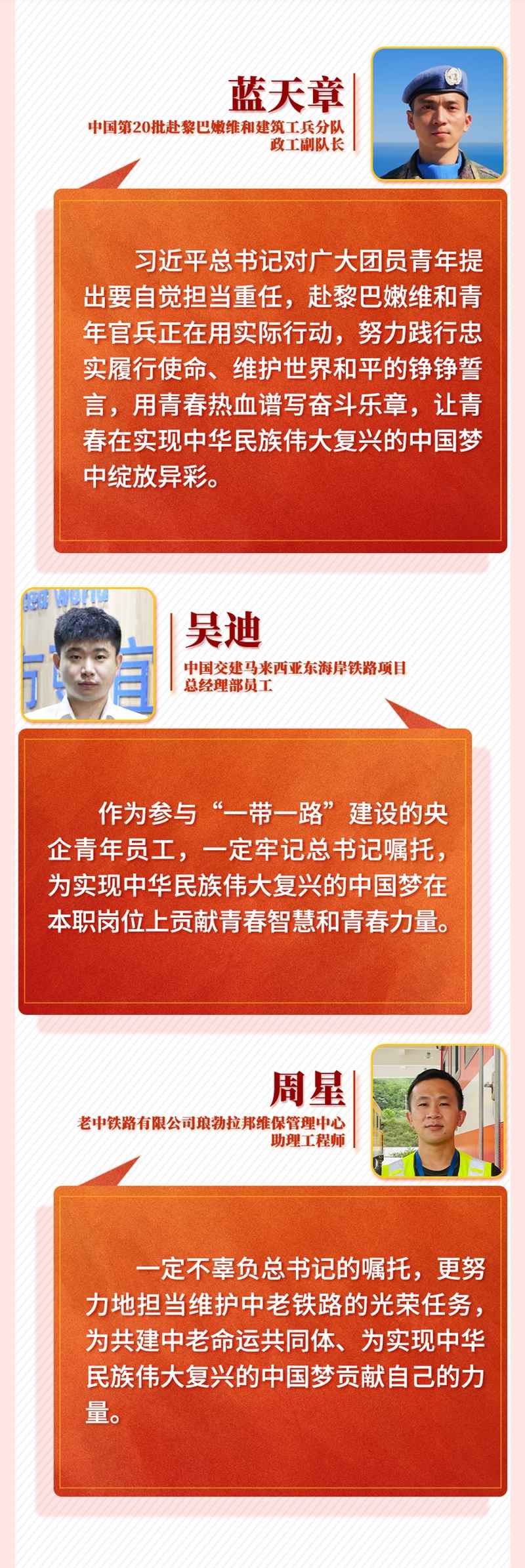 習近平總書記的重要講話令身在海外的中國青年備受鼓舞。他們一致表示,作為新時代的中國青年,一定牢記習近平總書記囑托,帶著夢想和使命,讓青春在海外煥發(fā)異彩,在實現中華民族偉大復興中國夢的新征程上奮勇前進,用青春的智慧和汗水打拼出一個更加美好的中國。