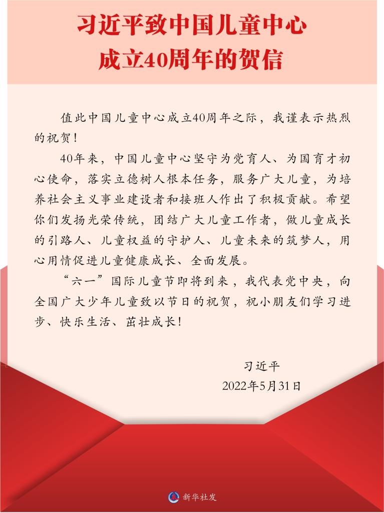 習(xí)近平致中國(guó)兒童中心成立40周年的賀信