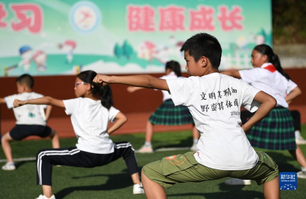 在陜西省安康市平利縣老縣鎮(zhèn)中心小學(xué)的操場上,學(xué)生們在課后參加武術(shù)社團(tuán)活動(2020年9月7日攝)。新華社記者 李一博 攝