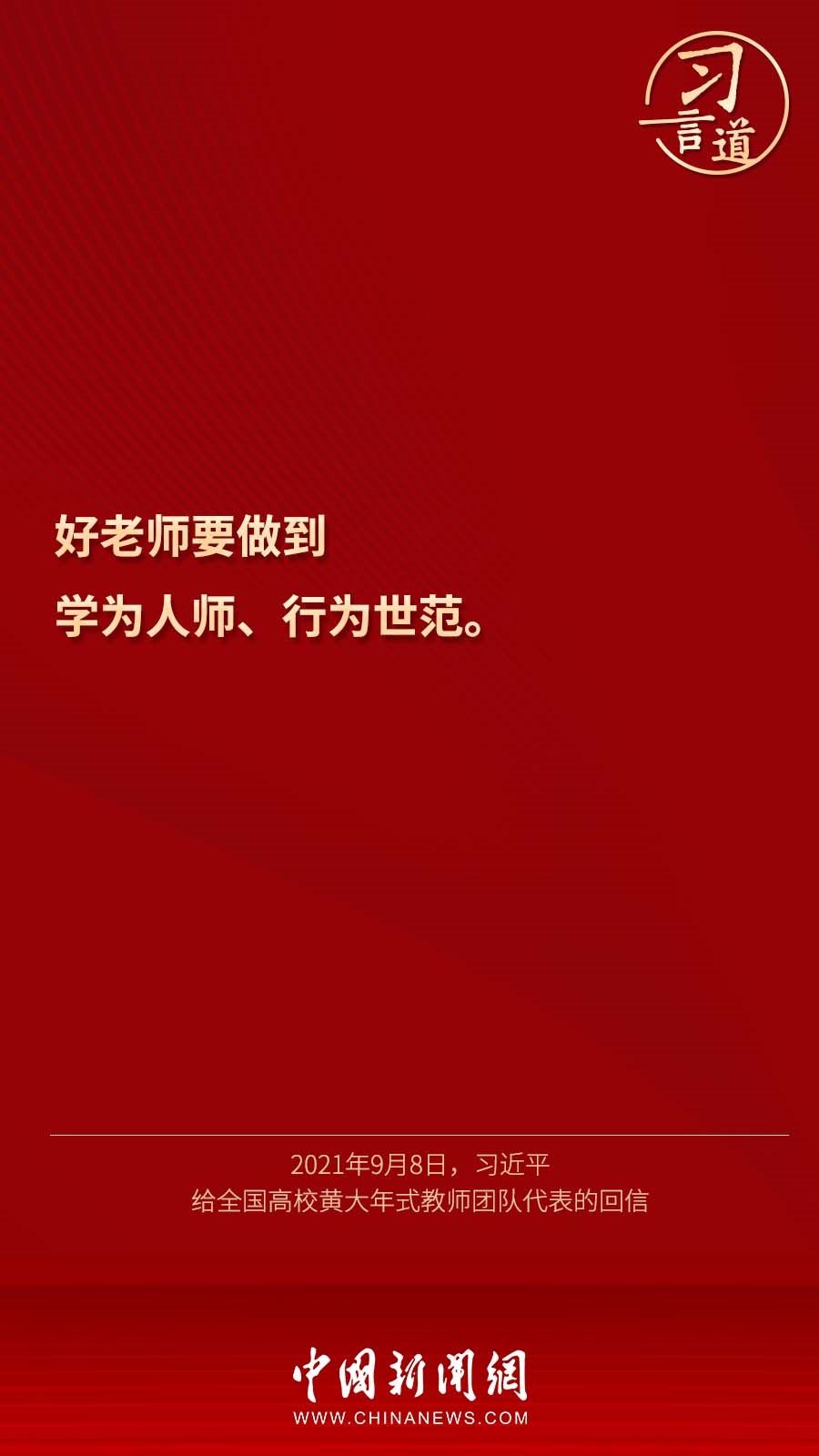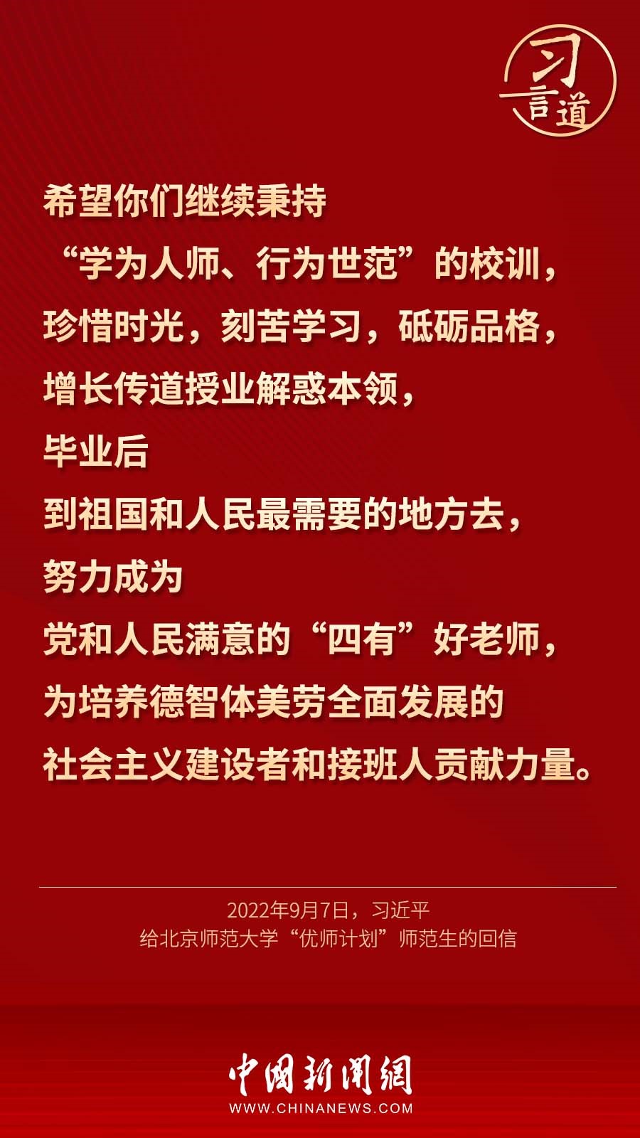 9月7日,習(xí)近平總書記回信勉勵(lì)北京師范大學(xué)“優(yōu)師計(jì)劃”師范生,努力成為黨和人民滿意的“四有”好老師。十八大以來(lái),習(xí)近平多次通過(guò)書信的形式,對(duì)教師群體寄予殷切期望。