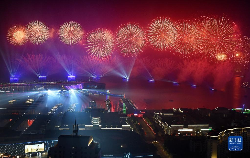 這是2018年6月9日晚在青島舉行的《有朋自遠(yuǎn)方來》燈光焰火藝術(shù)表演。2018年6月9日至10日,上海合作組織成員國(guó)元首理事會(huì)第十八次會(huì)議在青島召開。新華社記者 李紫恒 攝