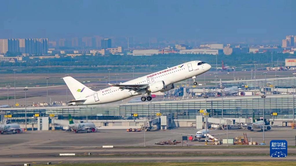 2022年5月14日6時(shí)52分,編號為B-001J的C919大飛機(jī)從上海浦東機(jī)場第4跑道起飛,于9時(shí)54分安全降落,標(biāo)志著中國商飛公司即將交付首家用戶的首架C919大飛機(jī)首次飛行試驗(yàn)圓滿完成。新華社發(fā)