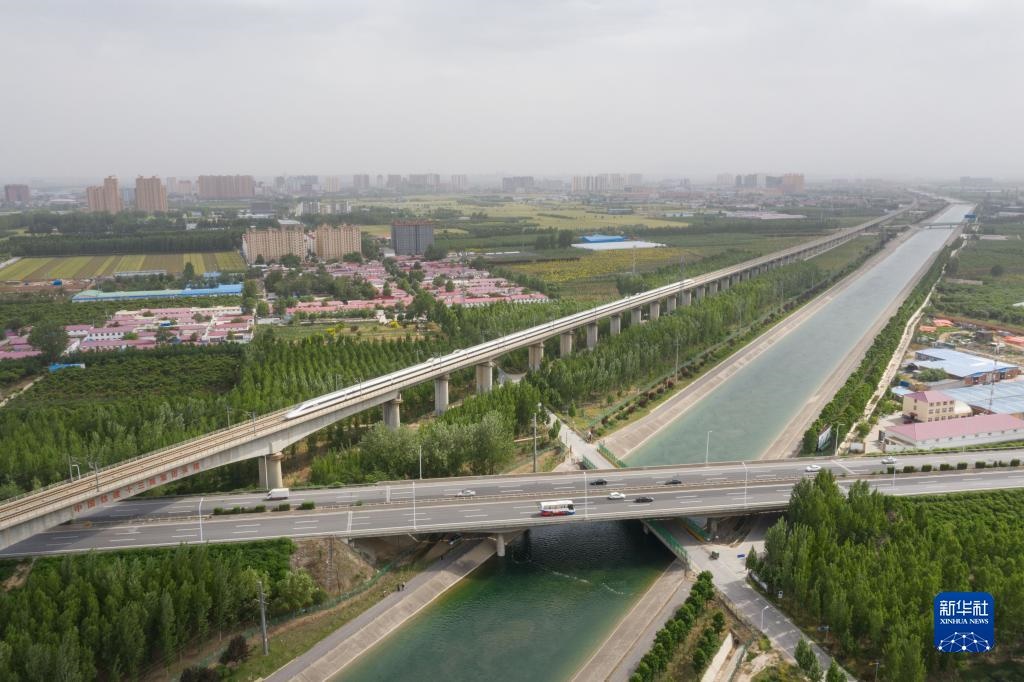 在河北省石家莊市正定縣以北的于家莊村附近,南水北調(diào)中線干渠與高鐵、公路交織(2021年5月24日攝,無人機照片)。新華社記者 才揚 攝