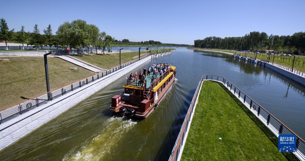 2022年6月24日,京杭大運河京冀段全線62公里實現(xiàn)游船通航。這是載著北京游客和建設(shè)者代表的游船通過船閘進入京杭大運河河北段。新華社記者 李欣 攝