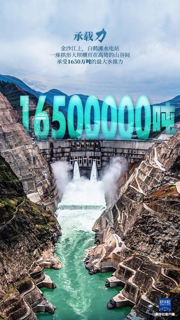 金沙江上,白鶴灘水電站,一座拱形大壩橫亙?cè)诟呗柕纳焦乳g,承受1650萬噸的最大水推力。
