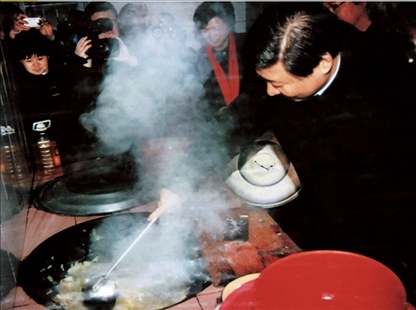 2007年1月,時任浙江省委書記習近平(右一)在浙江省慶元縣屏都鎮(zhèn)敬老院為老人們炒菜。新華社發(fā)