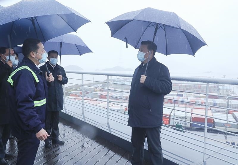 △2020年3月29日,習近平總書記在浙江寧波舟山港考察調研??疾旆稻┎蛔?0天,總書記在中央財經(jīng)委員會第七次會議上,首次提出構建新發(fā)展格局。