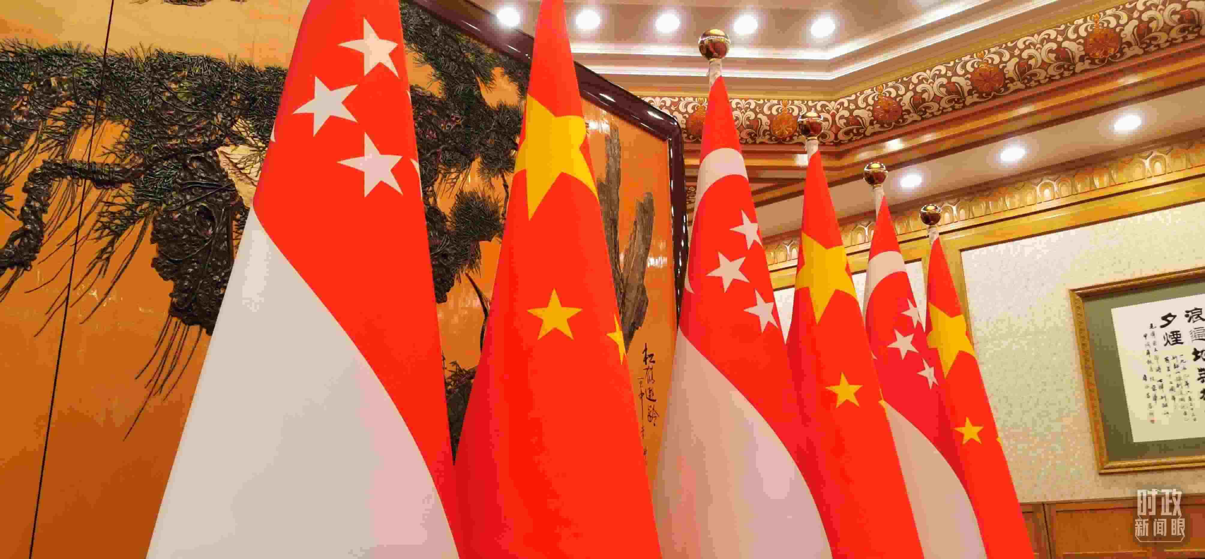 △會(huì)見現(xiàn)場的中新兩國國旗。(總臺(tái)央視記者李錚拍攝)