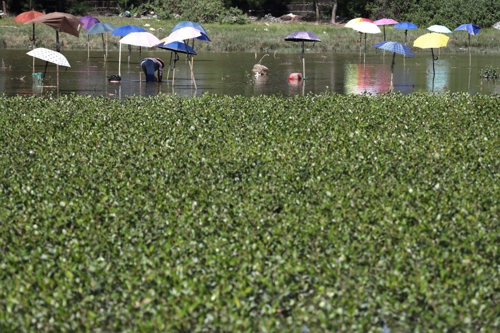 ↑村民在廣西欽州市欽南區(qū)犀牛腳鎮(zhèn)海邊的紅樹(shù)林苗圃里育苗(2021年10月3日攝)。