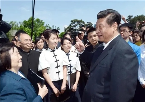 △2014年5月4日,習(xí)近平總書記在北京大學(xué)校園觀看北大師生紀(jì)念五四運動95周年青春詩會時同朗誦者親切交談。