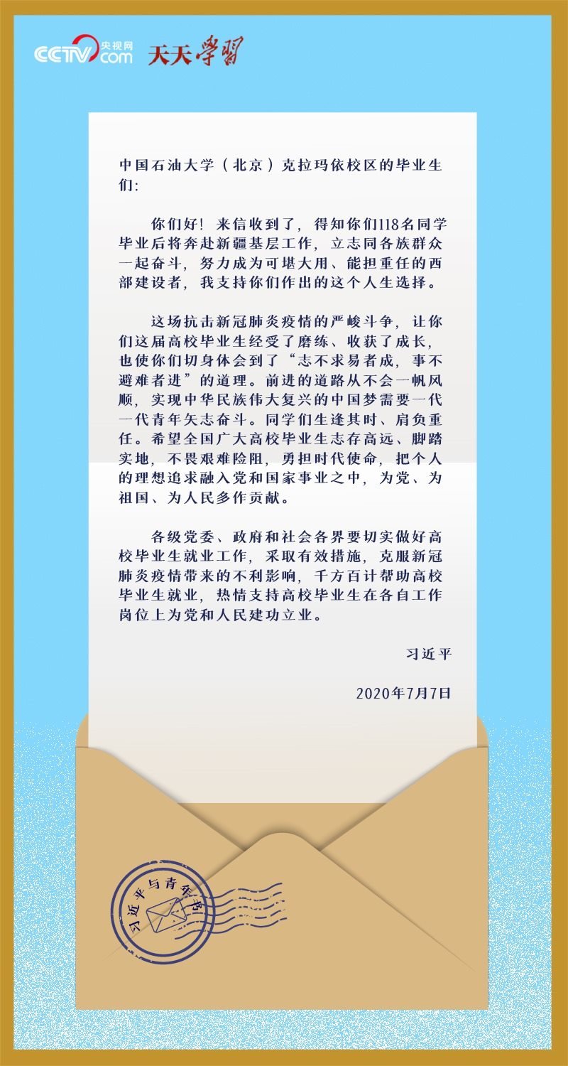 2020年畢業(yè)季,中國石油大學(北京)克拉瑪依校區(qū)118名即將到新疆基層就業(yè)的大學生,在離開母校之際,給習近平總書記寫信匯報了大學四年學習和思想上的收獲,表達了立志同各族群眾一起奮斗、建設美麗邊疆的決心。