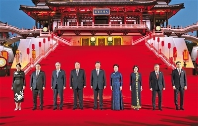 習(xí)近平夫婦為貴賓舉行唐朝傳統(tǒng)迎賓儀式。紫云樓前,禮樂和鳴,明快有力的古代佾舞、絢麗婀娜的芙蓉花舞,表達(dá)了古都西安人民的熱情好客,體現(xiàn)了中華文化兼容并蓄的精神風(fēng)貌。