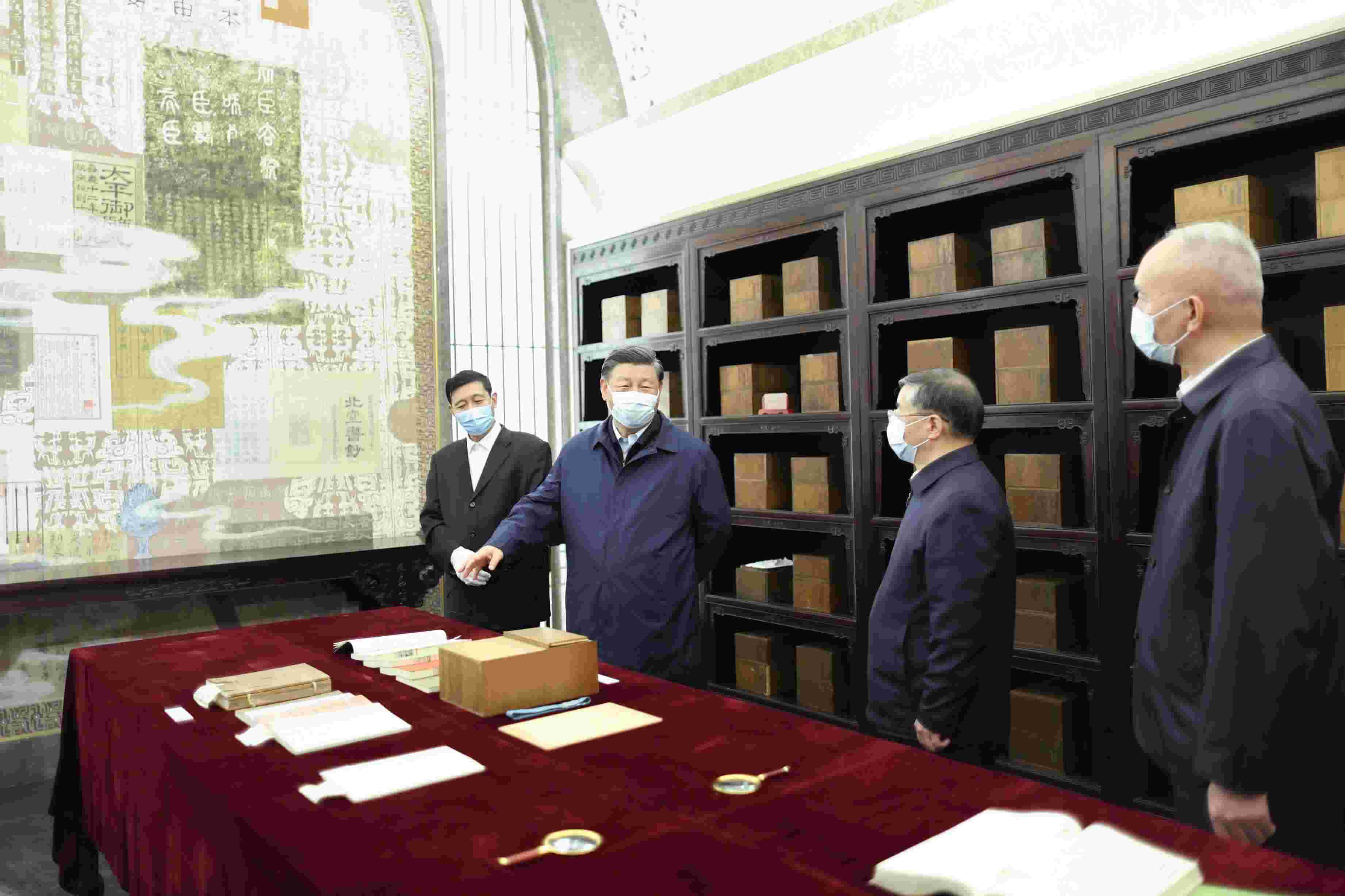 ▲6月1日下午,習(xí)近平總書記在中國國家版本館考察時(shí),在蘭臺(tái)洞庫了解館藏精品版本保存情況。