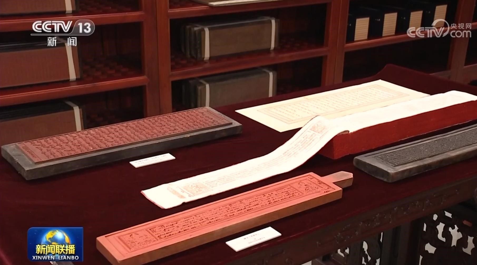 ▲圖為習(xí)近平總書記參觀的“漢藏蒙滿文大藏經(jīng)雕版合璧”庫展展品。