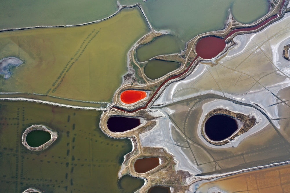 山西運城鹽湖一角(2021年6月1日攝,無人機照片)。新華社記者 詹彥 攝