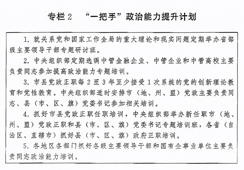 (二)突出“關(guān)鍵少數(shù)”政治訓(xùn)練。堅(jiān)持把政治訓(xùn)練貫穿干部成長(zhǎng)全周期,使干部的政治素養(yǎng)、政治能力與擔(dān)負(fù)的領(lǐng)導(dǎo)職責(zé)相匹配。強(qiáng)化“一把手”政治培訓(xùn),有計(jì)劃地選調(diào)地方、部門、國(guó)有企事業(yè)單位主要負(fù)責(zé)同志到黨校(行政學(xué)院)、干部學(xué)院參加專題培訓(xùn)。實(shí)施“一把手”政治能力提升計(jì)劃(專欄2)。?。ㄗ灾螀^(qū)、直轄市)、市(地、州、盟)、縣(市、區(qū)、旗)黨政領(lǐng)導(dǎo)班子成員每2至3年到黨校(行政學(xué)院)、干部學(xué)院至少接受1次系統(tǒng)的黨的創(chuàng)新理論教育和黨性教育,5年內(nèi)累計(jì)不少于2個(gè)月。圍繞提高政治能力和領(lǐng)導(dǎo)能力,加強(qiáng)機(jī)關(guān)司局長(zhǎng)、處長(zhǎng)任職培訓(xùn)。重視對(duì)女干部、少數(shù)民族干部、黨外干部等的政治培訓(xùn)。加強(qiáng)對(duì)高層次人才的政治引領(lǐng),中央組織部會(huì)同有關(guān)單位每年組織一定數(shù)量人才開(kāi)展國(guó)情研修。