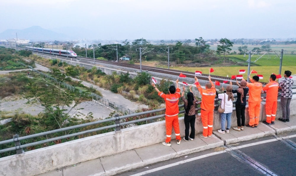 10月17日,在印度尼西亞萬(wàn)隆一座天橋上,雅萬(wàn)高鐵建設(shè)單位之一中鐵電氣化局的中國(guó)和印尼籍員工揮舞著中國(guó)和印尼兩國(guó)國(guó)旗,向遠(yuǎn)處駛來(lái)的一列雅萬(wàn)高鐵高速動(dòng)車組列車歡呼(無(wú)人機(jī)照片)。新華社記者 徐欽 攝