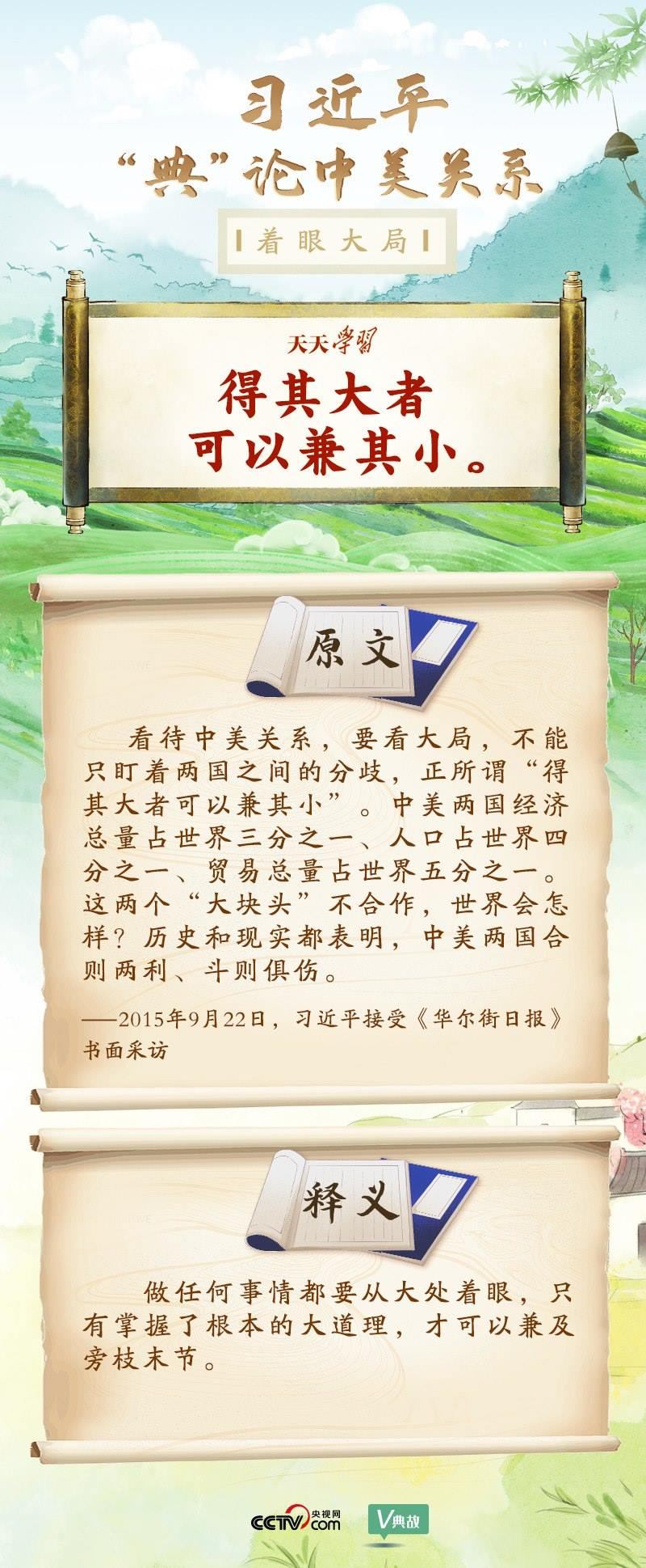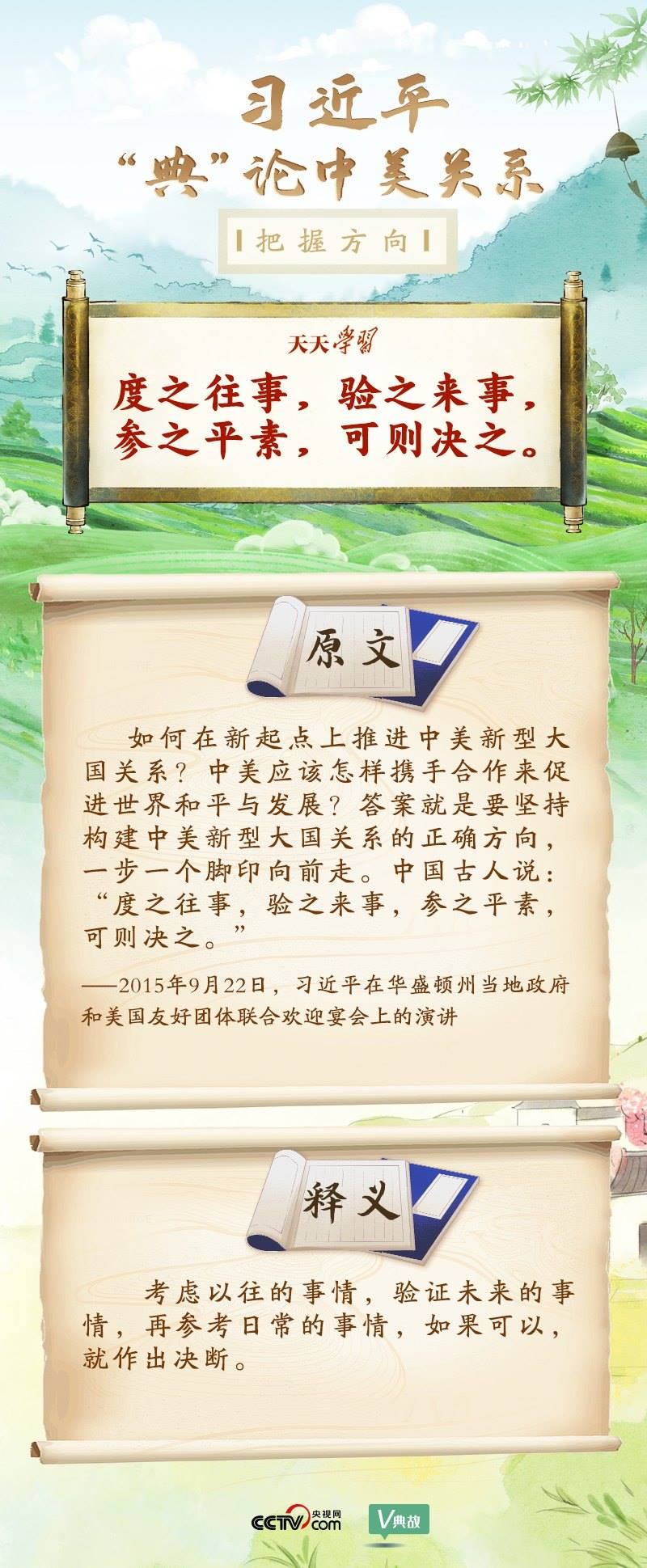 黨的十八大以來,習(xí)近平主席就中美關(guān)系發(fā)表了一系列重要講話。他站在時(shí)代高度分析、研判中美關(guān)系現(xiàn)狀及發(fā)展趨勢,并引經(jīng)據(jù)典為發(fā)展中美關(guān)系指出正確方向。這些論述蘊(yùn)含深刻的戰(zhàn)略思維和政治智慧,具有重大現(xiàn)實(shí)意義和深遠(yuǎn)歷史意義。央視網(wǎng)《天天學(xué)習(xí)》與您一起深刻領(lǐng)會(huì)。