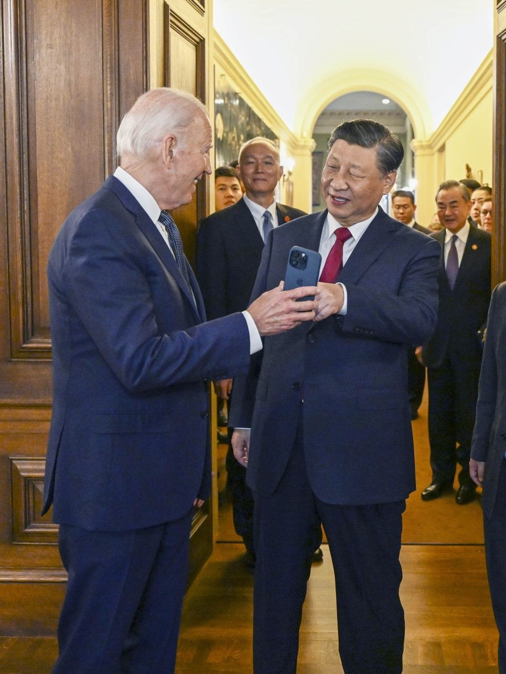 當(dāng)?shù)貢r(shí)間11月15日中午,美國舊金山郊外的斐洛里莊園,習(xí)近平主席結(jié)束同美國總統(tǒng)拜登的晤談,出席拜登總統(tǒng)舉行的宴會(huì)。這是拜登在手機(jī)上展示1985年習(xí)近平在擔(dān)任正定縣委書記時(shí)訪問舊金山的一張照片。新華社記者 李學(xué)仁 攝