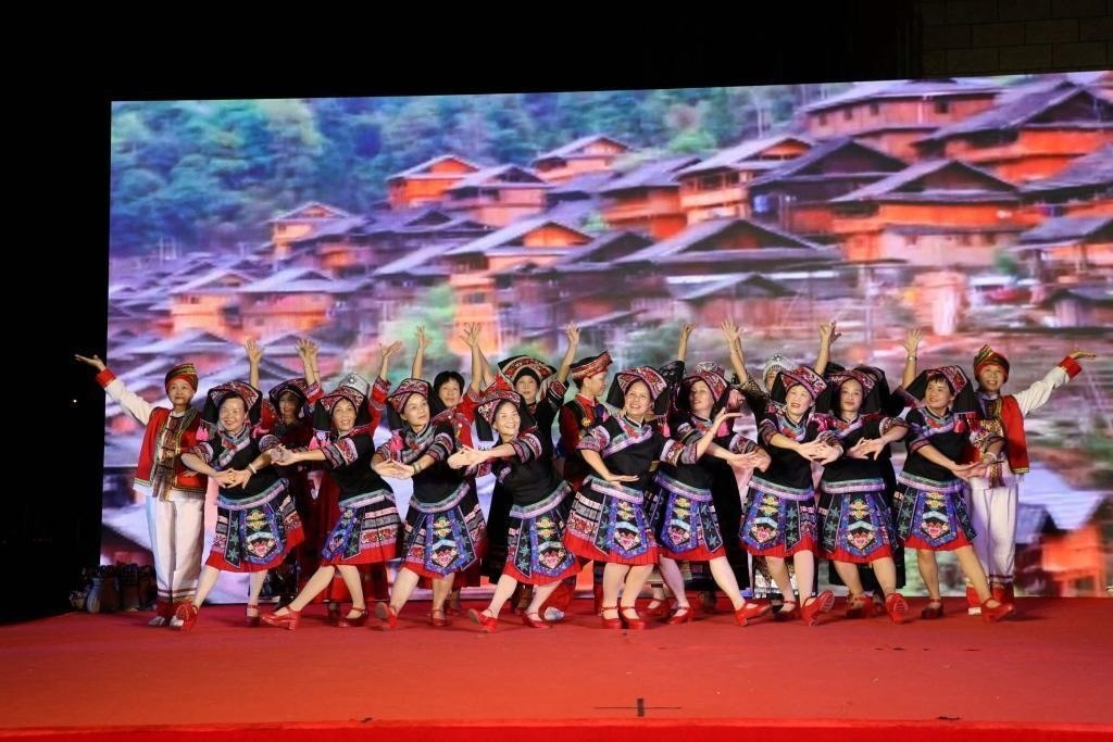 △2023年9月30日,廣西南寧市蟠龍社區(qū)舉辦的國慶節(jié)晚會(huì),居民們?cè)诒硌菝褡逦璧浮?/span>