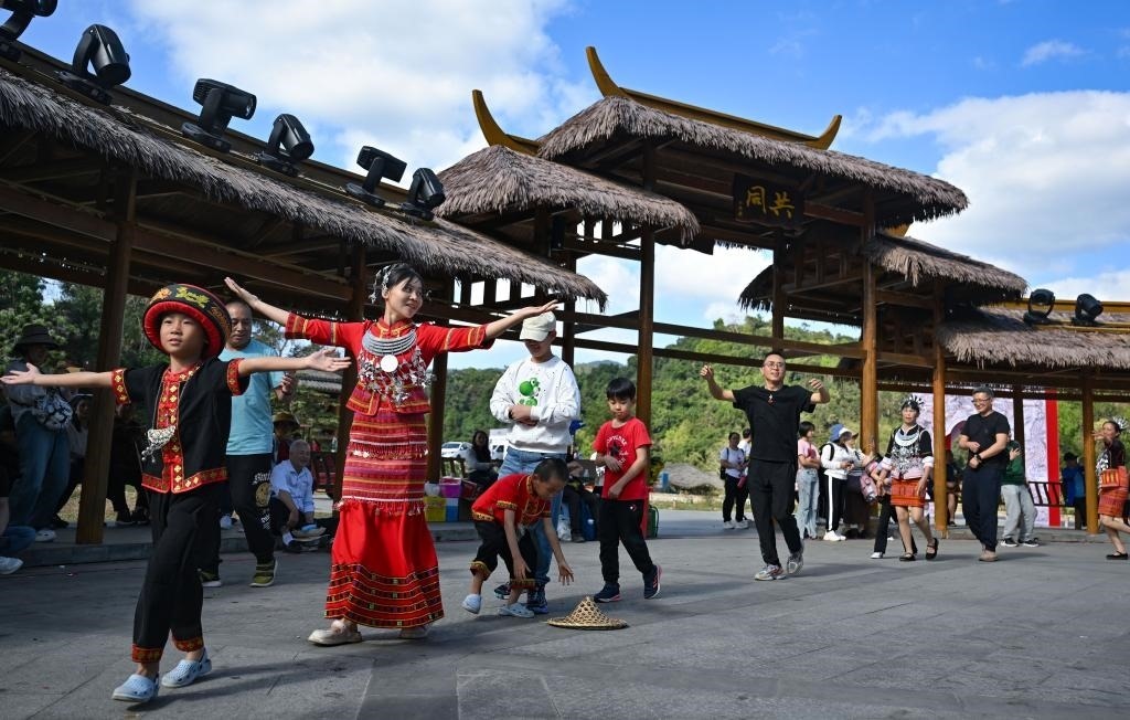 村里廣場(chǎng)上,村民王麗冰和姐妹們身著黎族傳統(tǒng)服飾載歌載舞,手中的簸箕歡快地移動(dòng),里面的茶葉上下翻飛,黎族姑娘采茶炒茶的生動(dòng)場(chǎng)景躍然展現(xiàn),贏(yíng)得游客陣陣掌聲。
