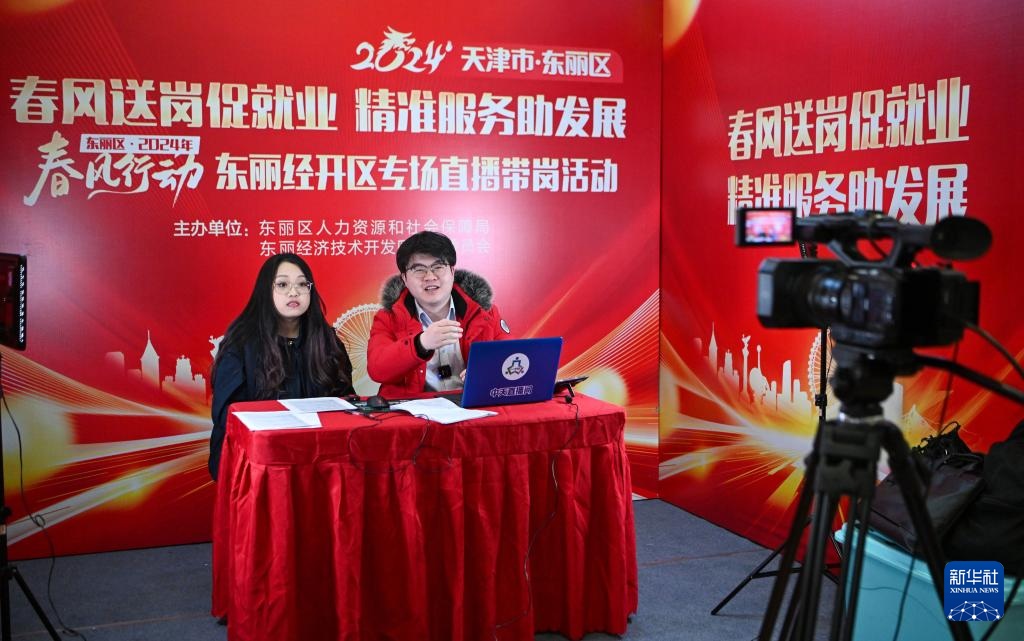 ??2024年2月29日,主播在天津市東麗區(qū)一場招聘會上進(jìn)行直播帶崗。新華社記者 孫凡越 攝