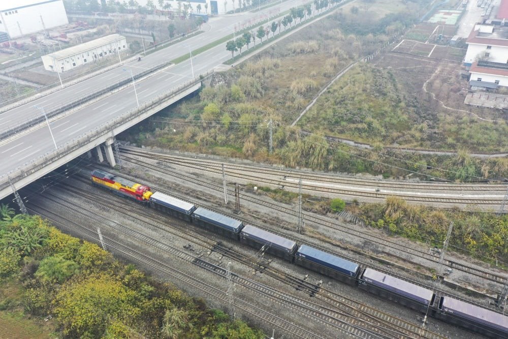 2023年1月22日,一趟西部陸海新通道鐵海聯(lián)運班列從重慶團結村中心站發(fā)車(無人機照片)。班列滿載著汽車、摩托車、發(fā)動機和純堿等共計100個集裝箱的貨物,將經(jīng)廣西欽州港換乘海船去往印度尼西亞、菲律賓、喀麥隆、澳大利亞等國家和地區(qū)。