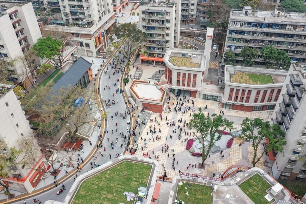 2023年4月28日,在竣工亮相的民主村片區(qū)城市更新項目(一期),人們在一處公共空間休息(無人機照片)。