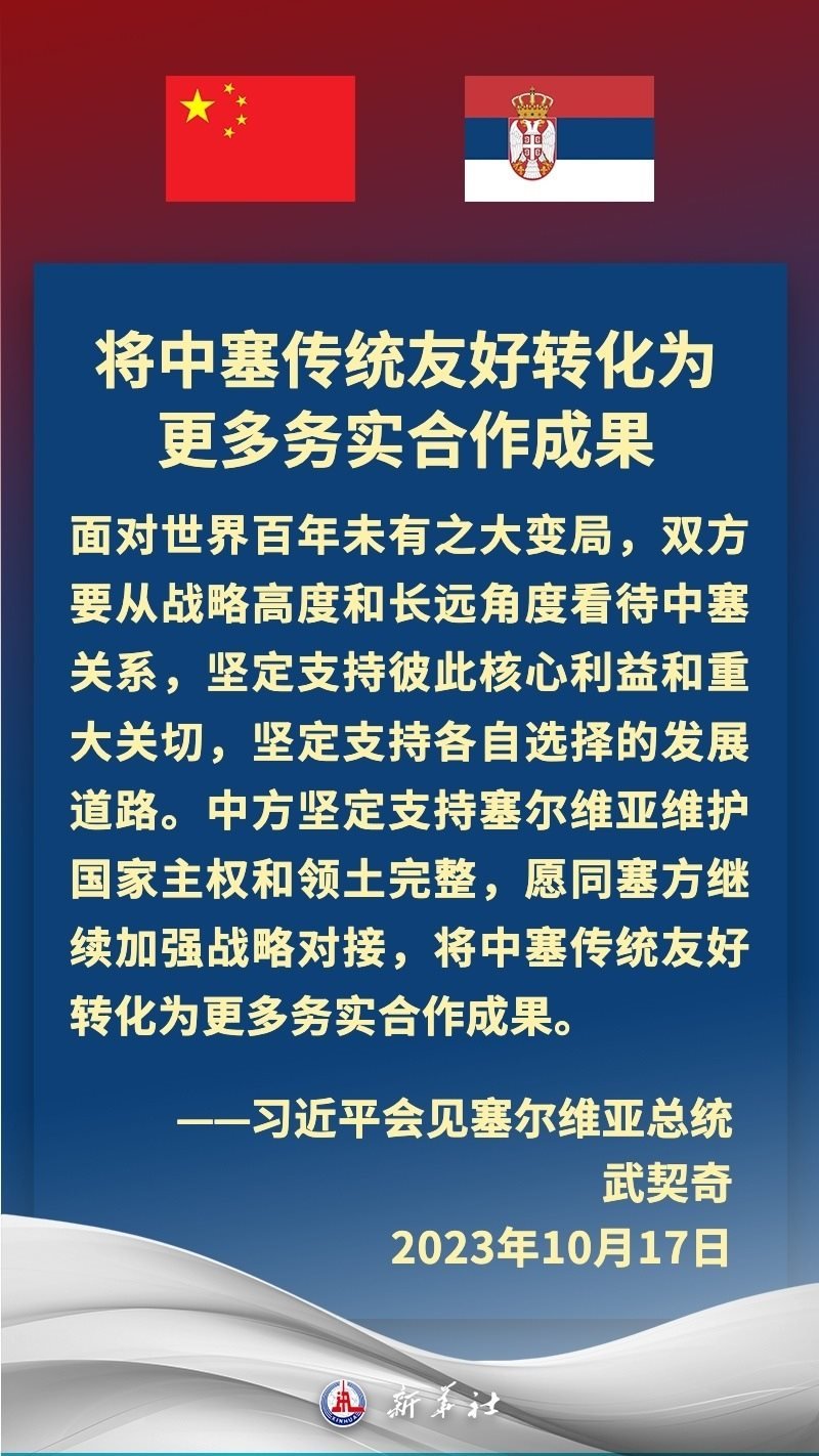 塞爾維亞是中國(guó)在中東歐地區(qū)首個(gè)全面戰(zhàn)略伙伴。近年來,在習(xí)近平主席和武契奇總統(tǒng)戰(zhàn)略引領(lǐng)下,中塞關(guān)系保持高水平運(yùn)行,雙方堅(jiān)定支持彼此核心利益和重大關(guān)切,兩國(guó)政治互信牢固,高質(zhì)量共建“一帶一路”取得豐碩成果,在多邊領(lǐng)域協(xié)調(diào)緊密。習(xí)近平主席多次在重要場(chǎng)合提及,中國(guó)和塞爾維亞是“鐵桿朋友”。