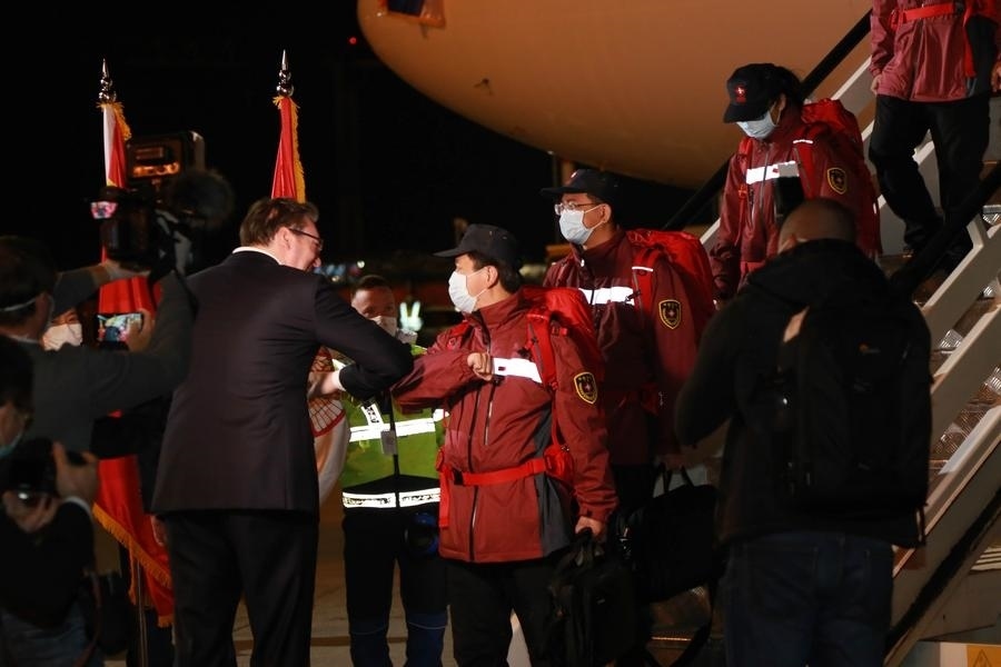 中國醫(yī)療團隊在貝爾格萊德尼古拉·特斯拉機場降落時已是深夜。武契奇率領(lǐng)塞方多名高級官員到機場迎接。疫情期間不建議握手,于是這位塞爾維亞領(lǐng)導(dǎo)人選擇和中國專家團成員一一碰肘以示尊重。對中國的及時支援心懷感激,他還在機場親吻了一面五星紅旗。