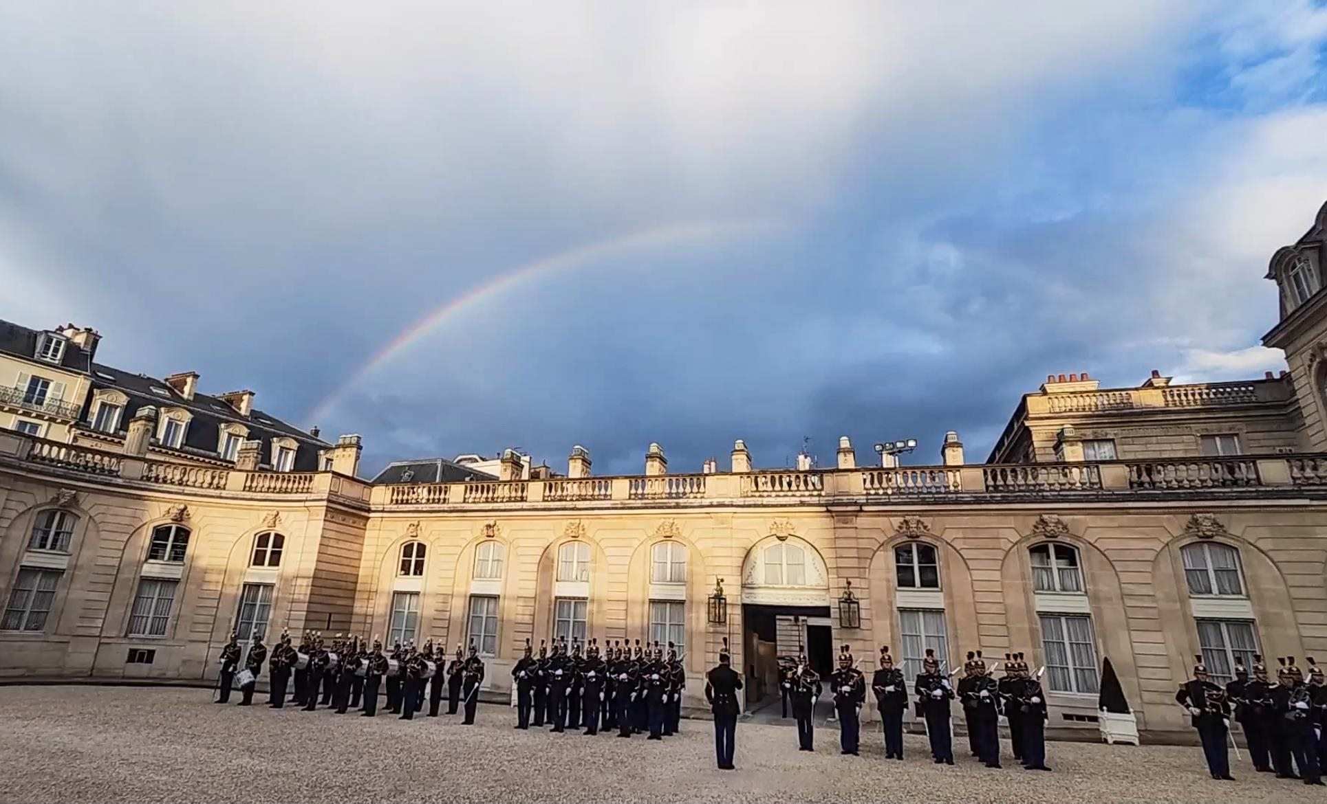 當(dāng)?shù)貢r(shí)間5月6日晚,習(xí)近平主席在巴黎出席馬克龍總統(tǒng)舉行的盛大歡迎宴會(huì)。宴會(huì)前,愛麗舍宮上空出現(xiàn)彩虹。彩虹連接著東西方。塞納河畔,正寫下中法兩國“雙向奔赴”的新故事。