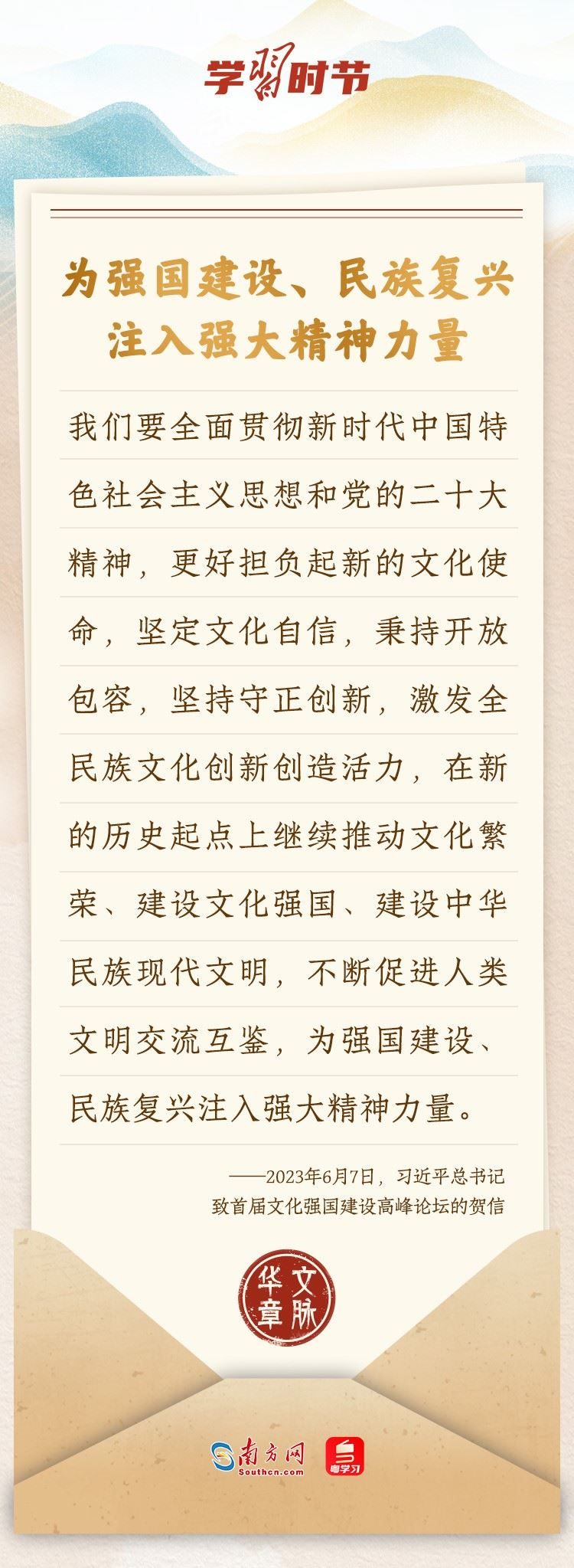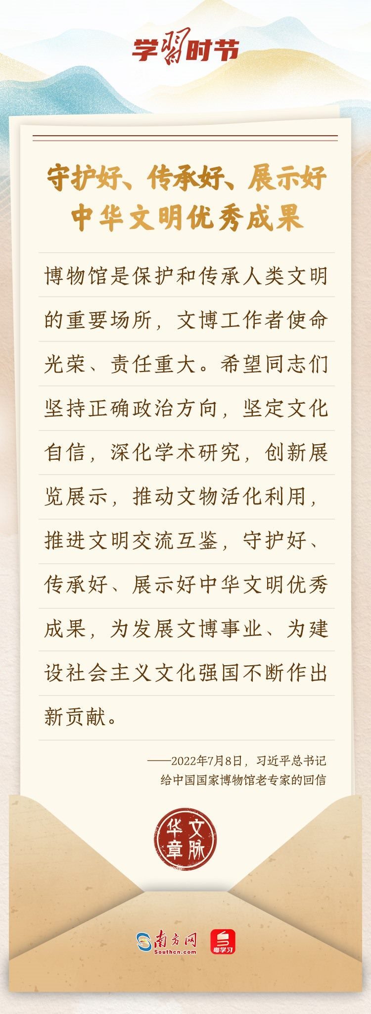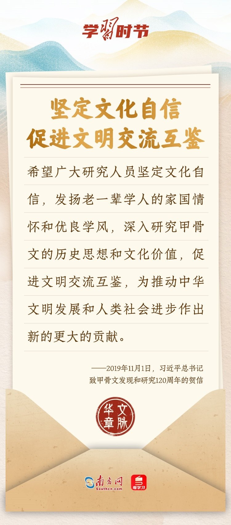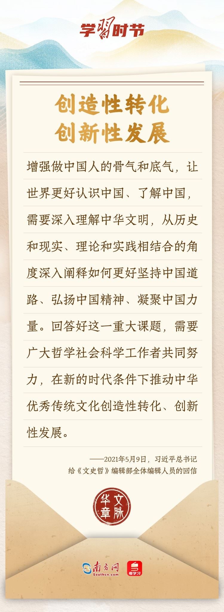 “中華民族在幾千年歷史中創(chuàng)造和延續(xù)的中華優(yōu)秀傳統(tǒng)文化,是中華民族的根和魂。”習(xí)近平總書記多次通過發(fā)賀信、寫回信等方式,表達著對弘揚中華優(yōu)秀傳統(tǒng)文化的殷切希望,飽含深情、字字暖心、催人奮進。讓我們一起“讀”信。