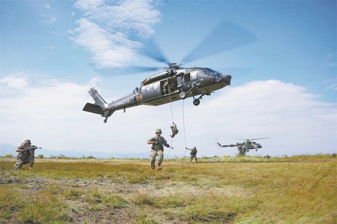 △第72集團軍某旅某合成營官兵在陸航部隊配合下開展機降訓練。