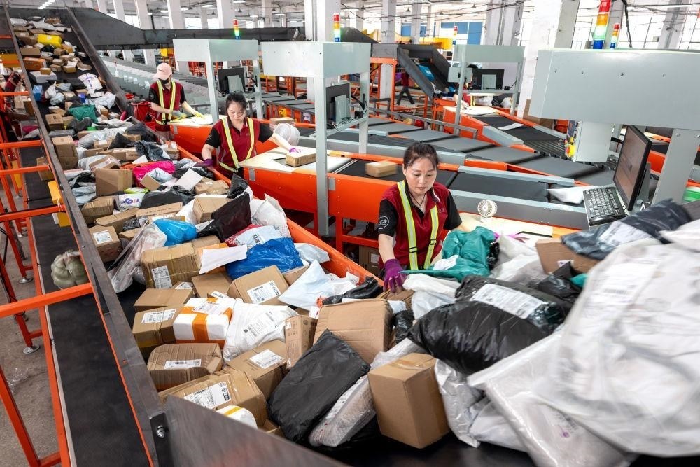 △截至6月30日,今年上半年我國快遞業(yè)務(wù)量突破800億件,比2023年提前59天。圖為2024年6月18日,在浙江湖州市長興縣一家快遞企業(yè),工作人員忙著分揀、掃描出庫等工作。