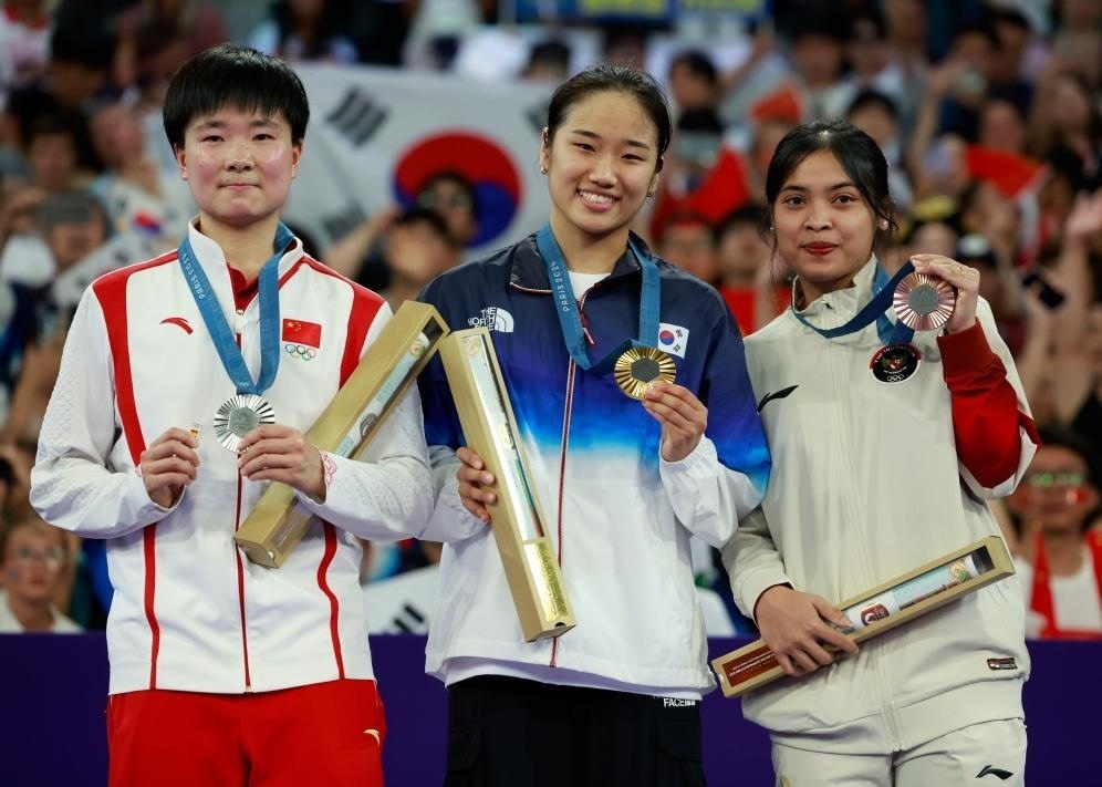 △8月5日,羽毛球女單冠軍韓國選手安洗瑩(中)、亞軍中國選手何冰嬌(左)、季軍印度尼西亞選手瑪麗斯卡在頒獎儀式上。