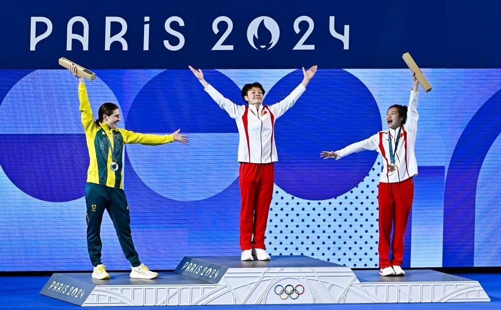△在巴黎奧運會跳水項目女子3米板決賽中,中國選手陳藝文獲得金牌,中國選手昌雅妮獲得銅牌。